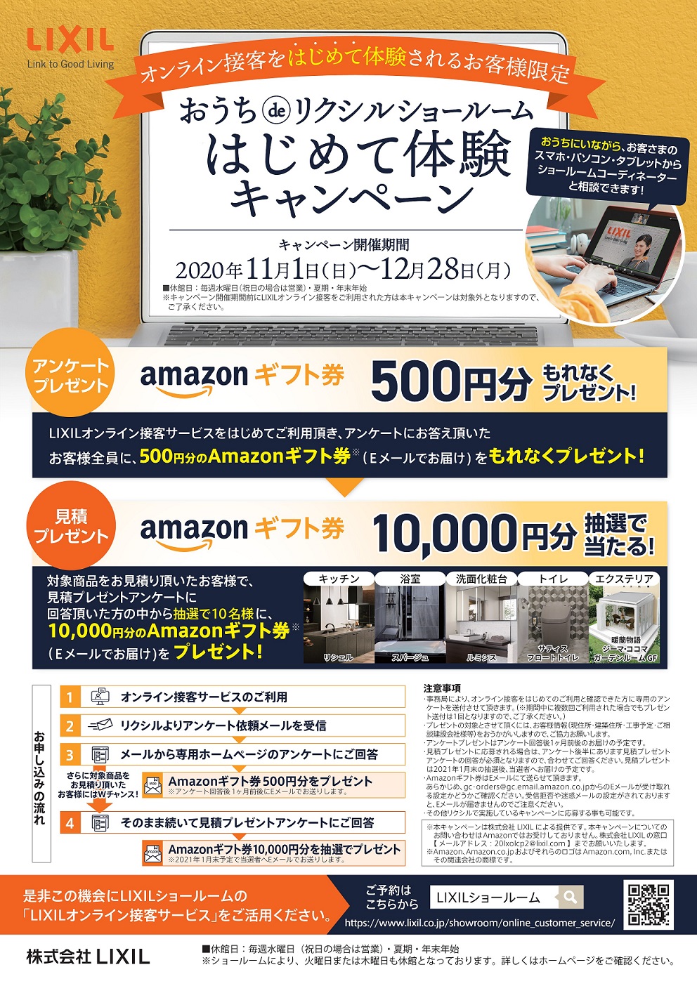 LIXILショールームのオンライン接客を初めて体験されるお客様限定キャンペーン!!