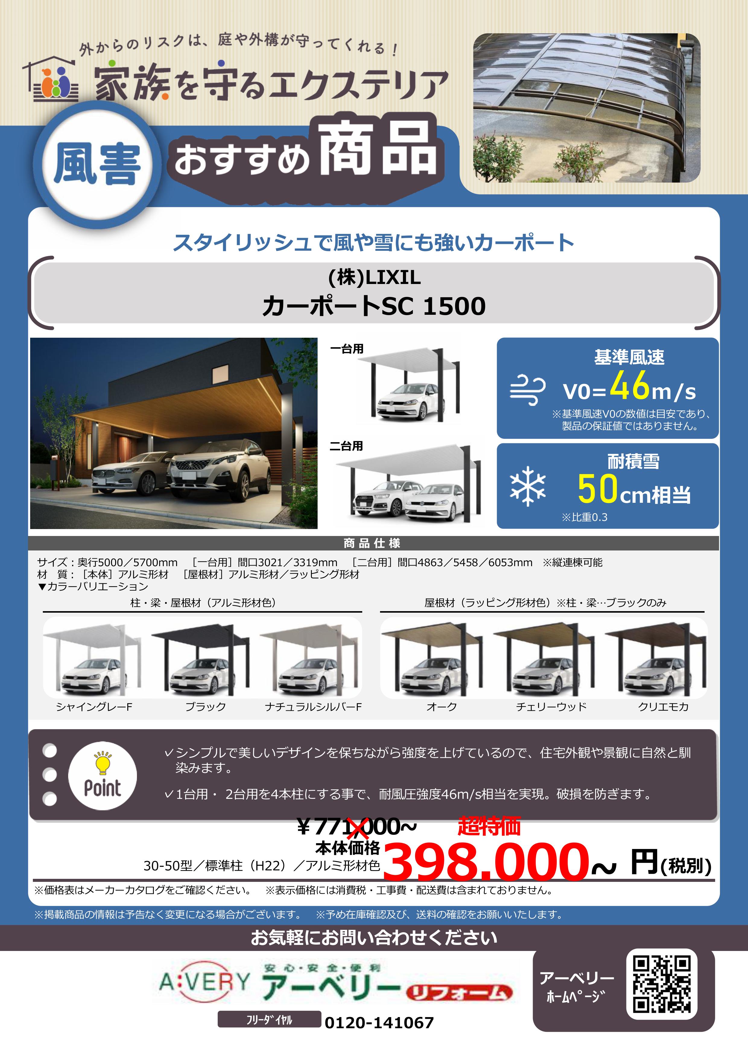 台風シーズンに備えて、風にも強い「LIXIL カーポートSC1500」